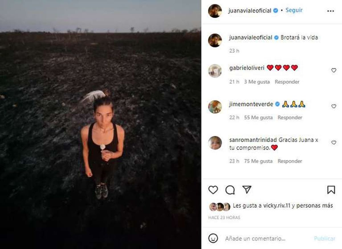 Sin embargo, desde allí, Juana Viale publicó una imagen «artística» y fue destrozada por los followers. En la foto se puede ver a Juana posando desde un campo quemado y con una flor en su mano. «Brotará la vida», escribió junto a la postal.